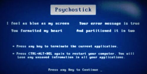 破壊屋で和訳ネタやるのは20年振りくらいかな?アメリカのPsychostick(サイコスティック)というメタルバンドに『Blue Screen』という曲があります。この曲は失恋した男性の悲劇を情感タップリに歌い上げるバラードで、その情感の凄まじさはボーカルが号泣…